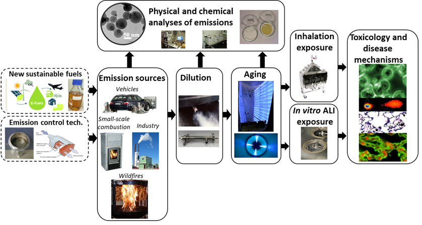 ILMARI research infrastructure offers versatile possibilities for studies on characteristics of emissions and aerosol particles, their atmospheric effects and toxicological properties. The laboratory is equipped with various biomass combustion appliances and reactors, dynamometers for engine experiments, and nanoparticle reactors. The emissions from these systems can be injected into a transformation chamber and a flow tube reactor, in order to study the atmospheric aging of emissions. Living cells and animals can be exposed to both fresh and aged emissions in an air-liquid interface cell exposure system and an animal exposure chamber, in order to study the health-related toxicological responses of fresh and aged aerosols from different sources. The laboratory is equipped with state-of-the-art sampling, dilution and analysis techniques for aerosol and gas-phase characterization.