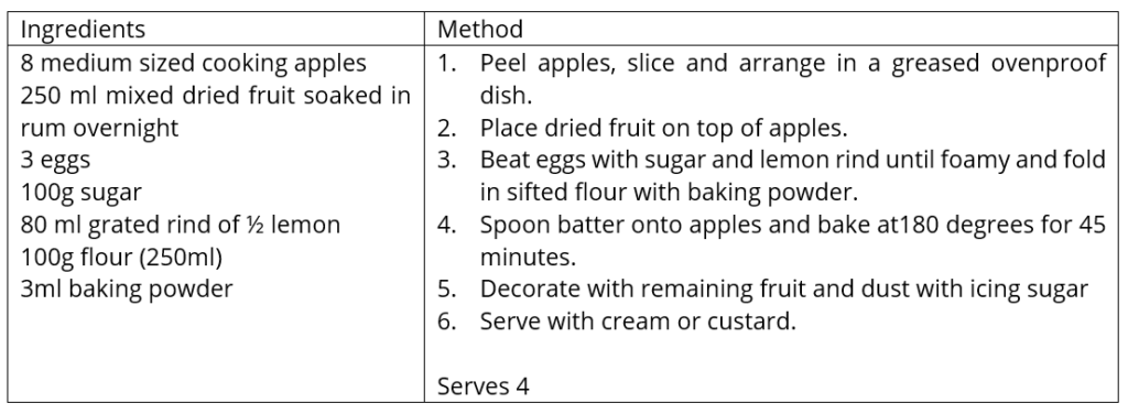 Apple pudding is a standard recipe to be scaled up as an example