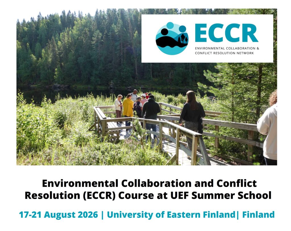 Environmental Collaboration & Conflict Resolution 2026 kurssin ilmoittautuminen on avoinna. Ilmoittautuminen päättyy 15.4.2026. Lisätietoa kurssista ja ilmoittautumisesta löydät täältä. Kurssin koordinaattori: Ida Herdieckerhoff ([email protected])