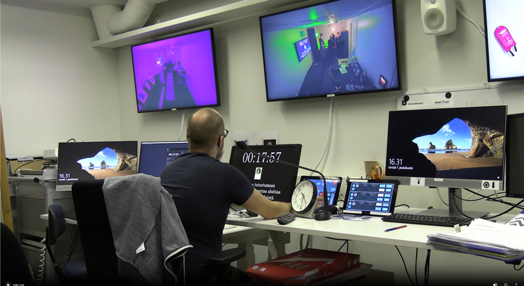 Tarkkaamosta käsin pelinjohtaja seuraa ja ohjaa pelihuoneissa tapahtuvaa toimintaa äänen ja kuvan välityksellä.