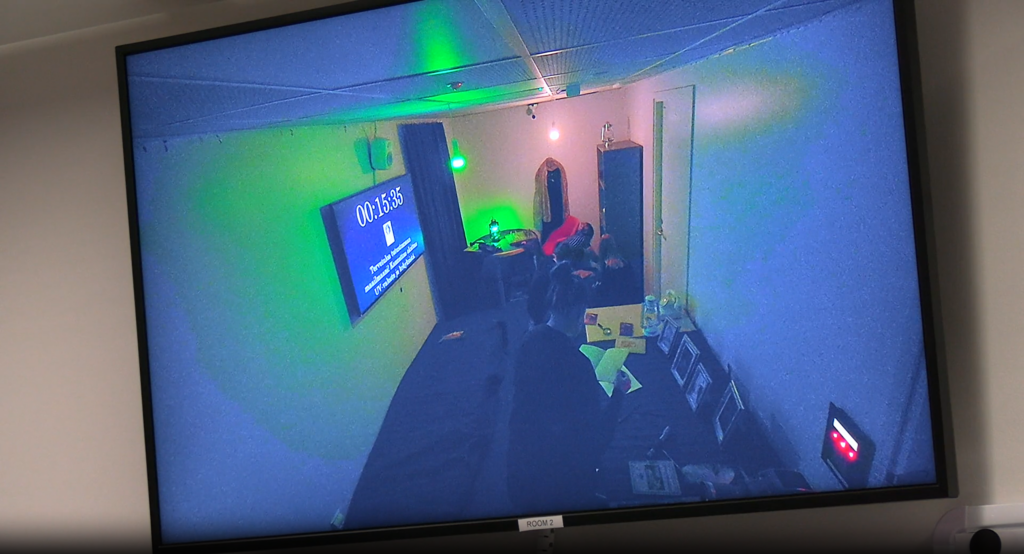 Tarkkaamossa on erilliset näytöt kullekin kolmelle pelihuoneelle sekä kolme työskentelypistettä tietokoneineen. Kamera- ja ääniohjauksen hallintapaneelien avulla pelihuoneissa tapahtuvaa toimintaa voidaan seurata, ohjata ja tallentaa keskitetysti.
