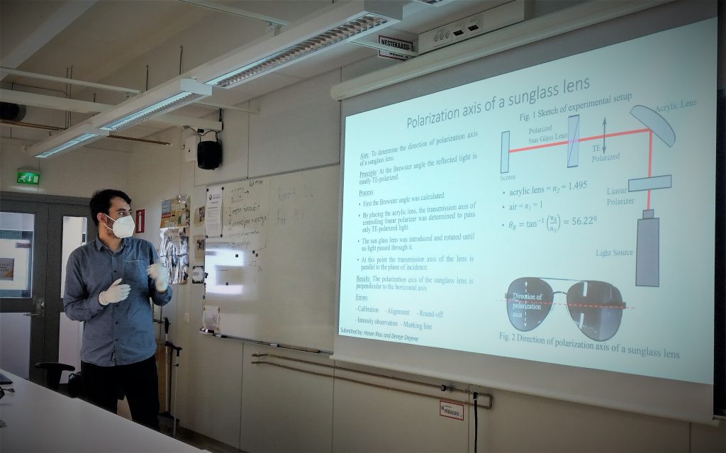 Työssä tehtävänantona oli määrittää polaroivien aurinkolasilinssien polarisaatioakselin suunta ennalta valittujen optisia komponenttien, mittalaitteiden ja muiden apuvälineiden avulla. Työelämäyhteyden näkymiseksi keksimme kuvitteellisen yhtiön Mikko’s Shadow, jonka toimeksiantona opiskelijat aloittivat selvittämään, miten annetuilla välineillä voi määrittää linssien läpäisyakselin suunnan mahdollisimman tarkasti.